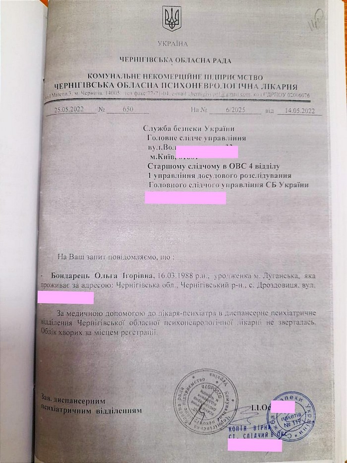Уродженку м.Луганськ 34-річну Ольгу Бондарець, мати трьох дітей (наймолодшому — 2.5 роки), а нині жительку села Дроздовиці, що на Городнянщині затримали поліція та СБУ 10 червня 2022 року за підозрою у "виправдовуванні збройної агресії росії проти України та її глорифікації". Утравні їй було оголошено підозру. 11 серпня 2022 р. Новозаводський районний суд міста Чернігова (суддя Павлов В.Г.) визнав Бондарець винною у вчиненні кримінального правопорушення, передбаченого ч.З ст.436-2 КК України (санкція статті передбачає від 5 до 8 років позбавлення волі) та призначив їй покарання у вигляді п'яти років позбавлення волі без конфіскації майна. Однак суд звільнив жінку від відбування призначеного покарання з випробуванням — якщо вона протягом іспитового строку в два роки не вчинить нового злочину і виконає покладені на неї обов'язки. Також у вироку зазначається, що з Ольги Бондарець повинно бути стягнуто 11 326 гривень процесуальних витрат на користь держави за проведення експертизи.