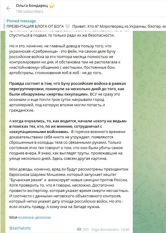«Я также верю президенту России, Белорусии и отдельно Чечне, что они нас не обидят... Свершилось. Тысячи танков, проезжающие мимо нашего дома — проехали с миром, у солдат были добрые глаза, я перекрестила, они улыбнулись а дети счастливо все это снимали на камеру, потому что попали в настоящее кино, зто не музей, нет, история Украины вершится прямо сейчас и мы ее свидетели».