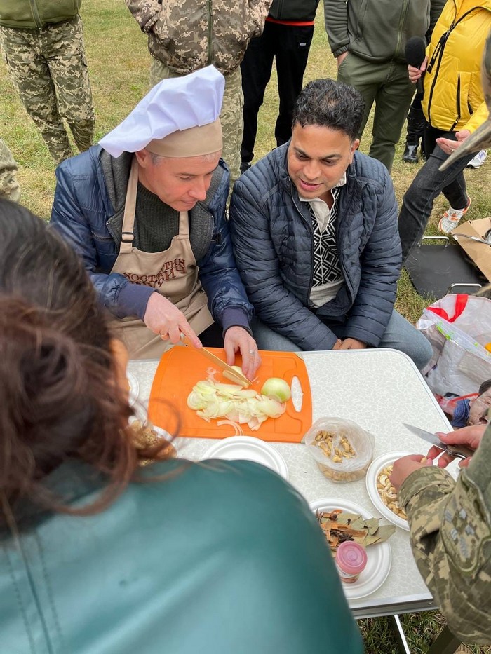 Поруч із борщем на сусідній конфорці польової кухні готували індійський плов без м’яса з новою для мене назвою — біріяні. Керували дією індуси, фахові кухарі. Допомагали місцеві жінки, військовослужбовці і навіть я цибулю нарізав тонкими півкільцями.
