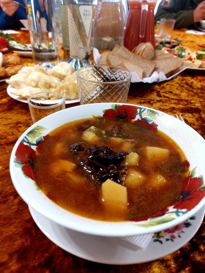 Узяти літр свіжого томатного соку. Півкіло свинячих реберець обсмажити на сухій сковорідці. Витягти їх. На тому жирку, що з них витопився, обсмажити нарізані кубиками цибулину і морквину. У ту ж сковорідку викласти реберця, влити частину томатного соку і все протушкувати. Закип'ятити воду, підсолити, покласти в неї порізані кубиками картоплю і один солодкий перець. Хай трохи покипить. Потім кладемо туди засмажку з реберець, доливаємо решту соку з помідорів. Через 20 хвилин вкидаємо 300 грамів чорносливу без кісточок. Кидаємо лавровий лист і доводимо до смаку. На густину страва має бути, як борщ. Подавати можна із зеленню і сметаною.