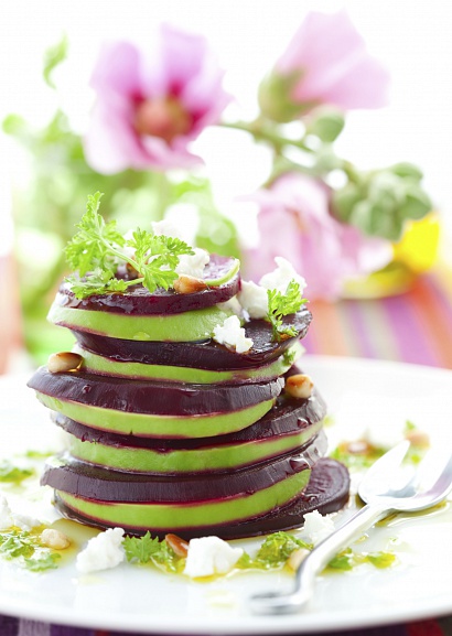 Приготування: буряк зварити чи запекти. Очистити, нарізати кільцями. Авокадо почистити, порізати, скласти разом із часником у блендер та зробити пюре. Додати сік лимона, подрібнену зелень, сіль, перець. Змастити кожен кружечок буряка пюре з авокадо, викласти один на другий.