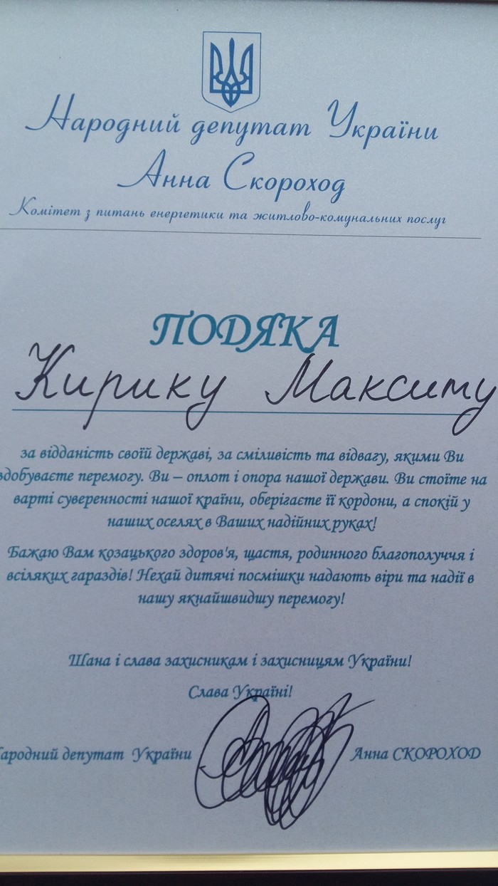 Анна Скороход вручила від імені Верховної Ради та від свого імені іменні годинники з пам'ятним написом Андрію Дирману, Роману Гільєвичу, Миколі Барганову, Миколі Романову, Максиму Кирику та Олександру Лобуру. Ще п'ятнадцятьом добровольцям вручили грамоти - подяки.