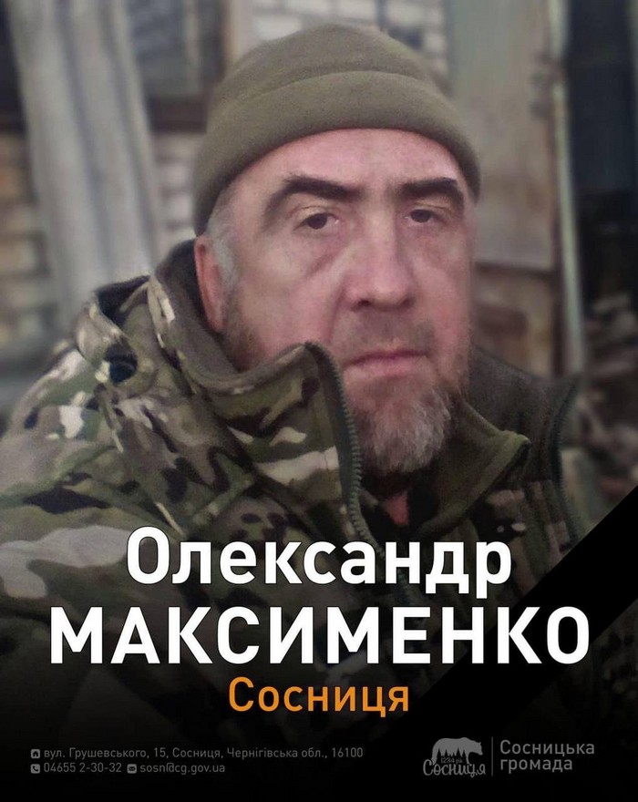 Старший сержант Максименко Олександр Вікторович народився 8 квітня 1979 року в смт. Сосниця. Тут навчався у місцевій школі, де закінчив 9 класів, після чого вступив до Сосницького СПТУ №31 - там у 1997 році чоловік опанував спеціальність "Водій - категорії "С".