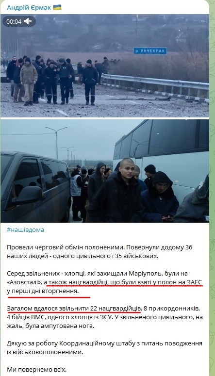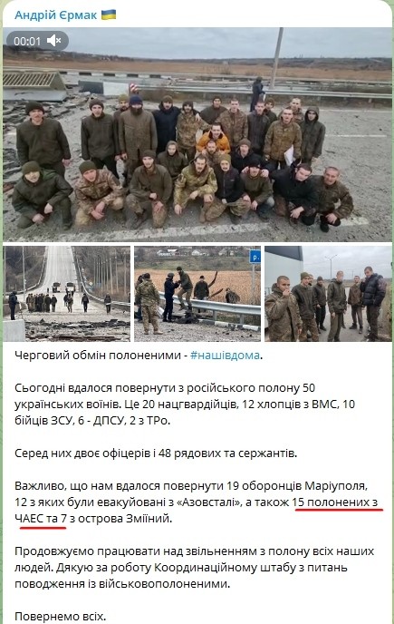 Проте в посту телеграм-каналу Єрмака від 23-го листопада мова йде про звільнених з полону на ЗАЕС. Наступного ж дня, 24 листопада з'явилася вже інформація про нацгвардійців саме з ЧАЕС. Це могла бути банальна плутанина і можливо з полону повернулось не 22 (7 у жовтні і 15 у листопаді) зі 169-ти, а 44, якщо припустити, що цифра 22 нацгвардійці стосується тих людей, яких викрали з ЧАЕС, а не з ЗАЕС. Сподіваємось, що найближчим часом ця інформація проясниться.