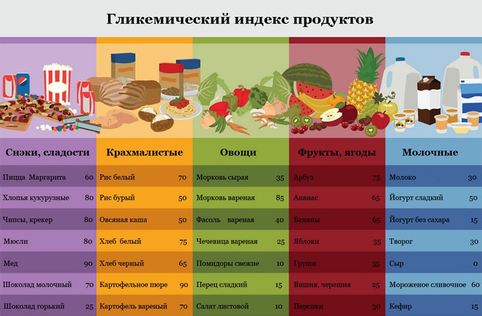 - Низкий (до 55: почти все свежие фрукты, некрахмалистые овощи, бобовые, нерафинированные злаковые, орехи, творог);