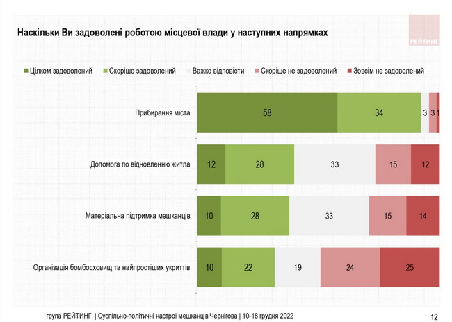 Оцінюючи роботу міської влади за конкретними напрямками, чернігівці поставили високу оцінку якості прибирання - 92% респондентів. Якщо говорити про такі питання як відновлення житла, то цей процес позитивно оцінили 40%, 33% - не змогли визначитися з відповіддю. Стосовно матеріальної підтримки мешканців, то задоволені нею 40%, решта розділилися порівну між тими хто не знаю що відповісти і тими, хто незадоволений.