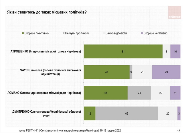 Поцікавилися під час опитування представники групи “Рейтинг” і ставленням чернігівців до місцевих політиків. Найвищу підтримку має Владислав Атрошенко - 81% ставляться до нього позитивно, 10% - негативно. З початку війни ставлення до нього або покращилося (36%), або не змінилося (51%).Такі цифри пояснюються, в тому числі, і тим, що Владислав Атрошенко забезпечував функціонування міста протягом всього періоду його облоги росіянами. Крім того, мер займався питаннями оборони Чернігова та ТРО. А після завершення активних бойових дій його діяльність спрямована на відновлення міста та налагодження зовнішніх контактів, які б вплинули на подальший розвиток Чернігова.