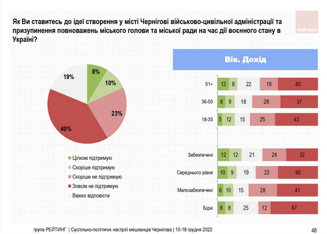 Дві третини негативно ставляться до ідеї створення у Чернігові військово-цивільної адміністрації та призупинення повноважень міського голови та міської ради на час дії воєнного стану в Україні. Підтримують таку ініціативу – 18%.