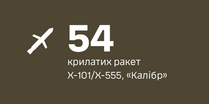 За попередніми даними, всього було застосовано в ударі 69 ракет. Силами і засобами Сил оборони України знищено 54 ворожі крилаті ракети.