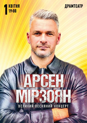 01 квітня 2023 р. (субота), 19.00, у Чернігівському обласному академічному театрі ім. Т.Г. Шевченка відбудеться концерт Арсена Мірзоян у Чернігові.