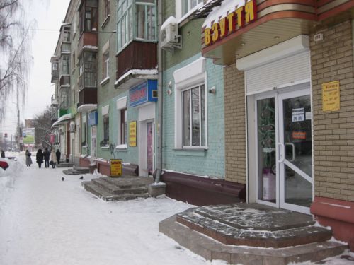 Выше по ул. Щорса я прошла мимо партийных офисов. Крылечко УНП не вызвало у меня подозрений, а вот при подъеме к офису партии «Батьківщина», хотя и поручни есть, пострадать несложно! Такое же опасное крыльцо соседнего банка, благо – можно ухватиться за перила. Проверку «на скользкость» у меня прошли крылечки магазинов «Світ шпалер» и «Магія світла» – молодцы, выбрали для покрытия нескользкие материалы! Ну, а крылечко в нашем офисе – не ахти, но хотя бы постелен пластмассовый коврик, который нас и «тормозит».