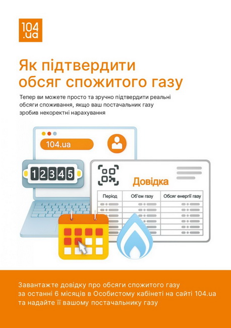 Автоматично сформована онлайн-довідка стане у нагоді клієнтам 104.ua, які хочуть оскаржити невідповідні нарахування постачальника, і довести свою правоту співробітникам Нафтогазу. Дані про обсяги споживання доступні після сканування QR-коду, і отримуються напряму з системи 104.ua. Формувати подібну довідку можна один раз на день.