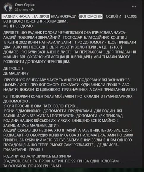 Зазначимо це не єдиний допис Серика в якому він викриває зловживання на гуманітарці. Також в січні він оприлюднив документи про купівлю чиновниками ОВА будматеріалів для відновлення пошкодженого житла по завищеним цінам.