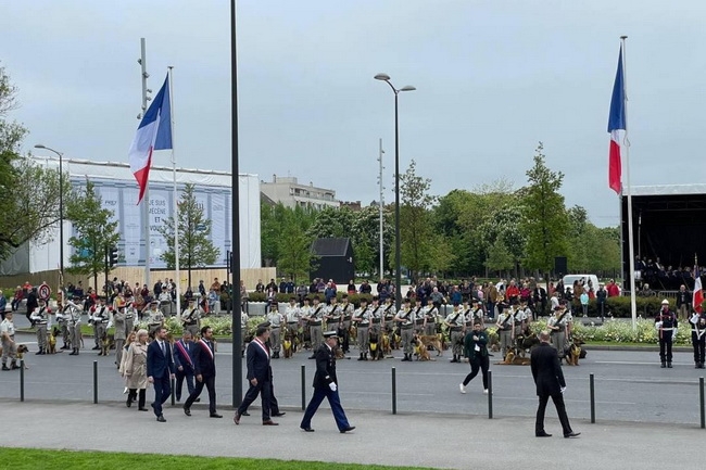 Наше гасло «ніколи знову» не було настільки рішучим. Європа і світ знову повторили помилки, які розв'язали руки диктатору, і новий Гітлер XXI століття знову насмілився кинути викли всьому світові та пішов війною. Він нищить мирні міста, вбиває наших дітей, змушує мирних українців шукати прихистку по всьому світу, щоб вберегти себе. Українці гідно протистоять цій агресії. Вже понад 439 днів, як ми стали щитом від зла та не пустили ворога на територію Європи, та на території України захищаємо наші спільні цінності — свободу та демократію в усьому світі. Ми робимо це не самі, нас підтримує і допомагає весь цивілізований світ. Я, користуючись нагодою, хочу сказати слова вдячності народові Франції за військову, політичну та гуманітарну підтримку нашої країни. Щодо військової — давайте робити це швидше, щоб зупинити жах цієї війни, загибель мирних людей. Уроки Другої світової говорять ще і про те, що зло обов‘язково має бути покаране. В день перемоги над нацизмом ми боремося за нову перемогу. І вона обов‘язково буде. А після неї — справедливий суд над злочинцями. Щоб уже точно — «ніколи знову».