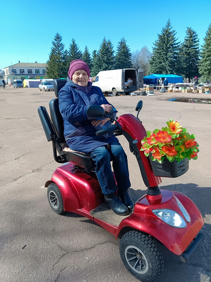 73-річна Тамара Набока із Сосниці до місцевого базару під’їжджає на вишневому електровізочку. Транспорт на чотирьох колесах. Є кермо, як у скутера. Зручне сидіння. Глушить мотор, із корзини, що біля керма, бере сумочку і йде за покупками.