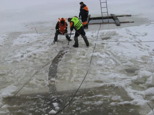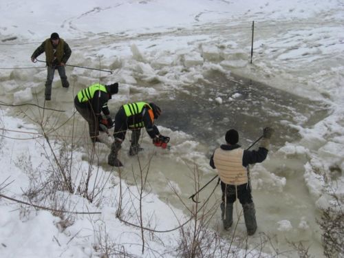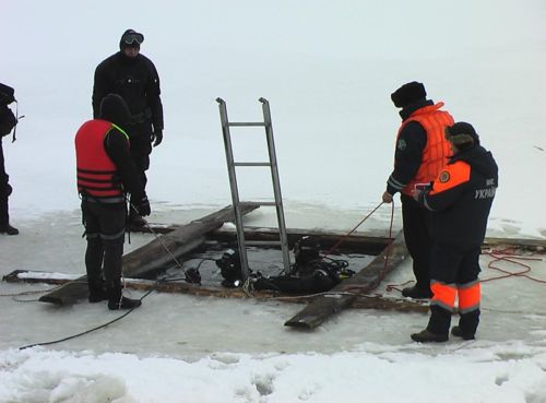 За допомогою металошукача на відстані 20 м від берега було визначено під водою можливе місце знаходження автівки. Рятувальники прорубали лунки та в спеціальних водолазних костюмах розвідали дно. На глибині 8-10 метрів вони знайшли джип, в салоні якого знаходилися тіла двох дівчат та одного чоловіка. Водолази підняли їх на поверхню, а потім за допомогою потужної спецтехніки витягли на берег сам автомобіль. Під час проведення пошукових робіт з родичами загиблих працювала група психологів МНС України.