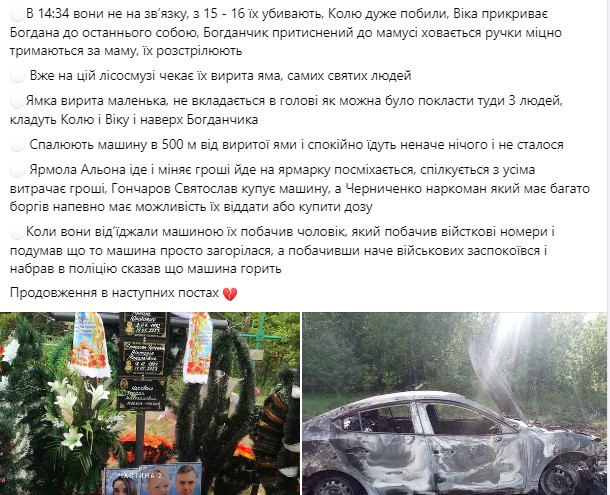 Для тих, хто нічого не чув про цю історію, або призабув ключові обставини, нагадємо їх, 15 травня на фейсбук-сторінці "Менщина" з'явилось повідомлення про зникнення родини киян — 28-річної Вікторії Єрмолової-Черевань, 4-річного Богдана Череваня та 30-річного Миколи Череваня. Його написала Марія Закалюжна кума зниклих. Родина 14 травня поїхала купляти іномарку до Мени і перестала виходити на звязок після 14.30. Зранку 15-го травня представники органів влади звертаються до редакцій місцевих видань, аби ті не розповсюджували інформацію про злочин, який стався у Корюківському районі, якщо їм стане про нього відомо, не з офіційних джерел, аби не злякнути зловмисників, яких повним ходом розшукували правоохоронці по гарячих слідах.