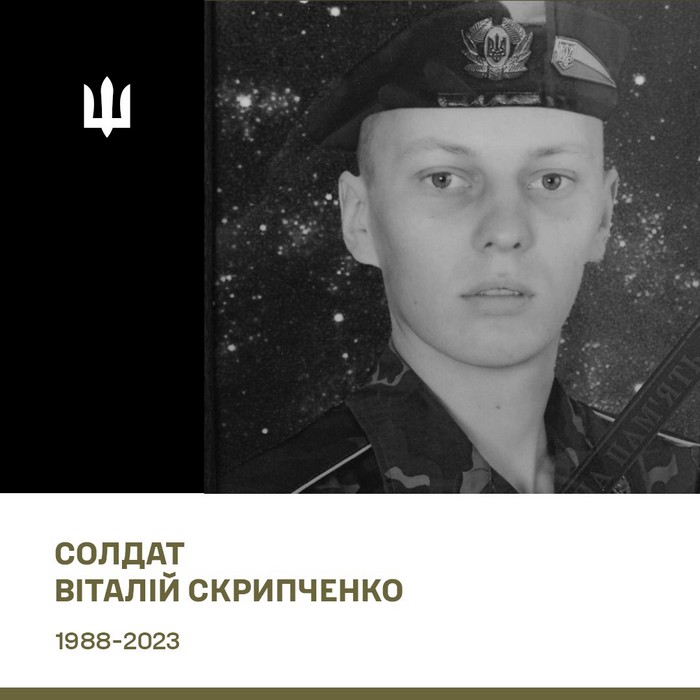 На жаль, 28 травня 2023 року під час виконання бойового завдання на Луганщині Скрипченко Віталій загинув. Попрощалися з воїном на його малій батьківщині, поховавши на місцевому кладовищі.