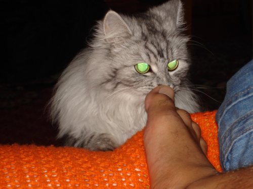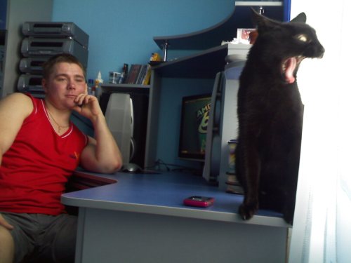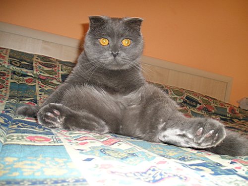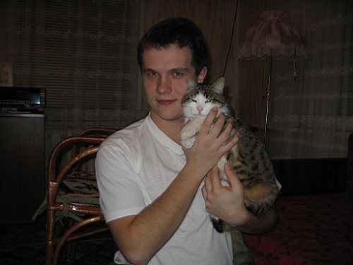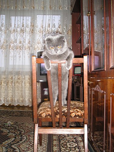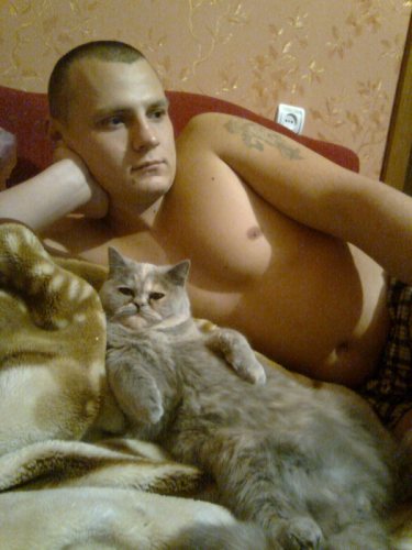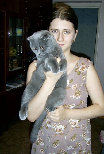 Изображен рядом с хозяином, во избежание мошенничества и обмана))) Кота зовут Rich(Рич, Ричи), ему 2 года, порода Scotish Stright.
