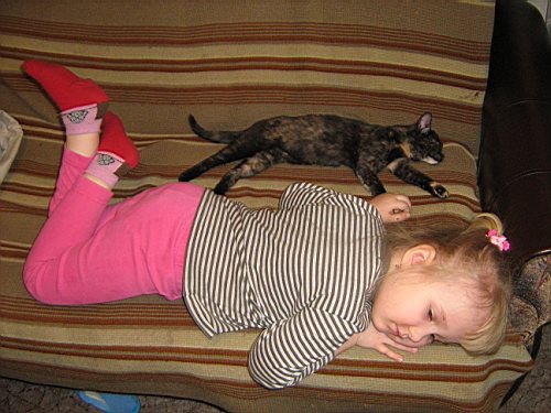 Кошка – Бася, 1 год. Бася и моя дочь Вика: "Спят и мухи и слоны...".