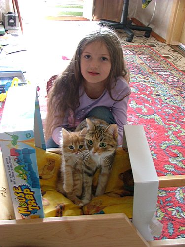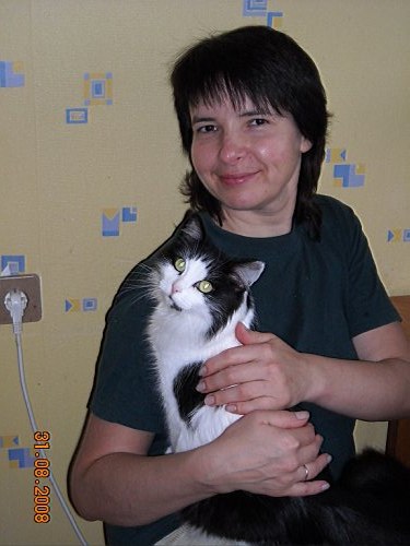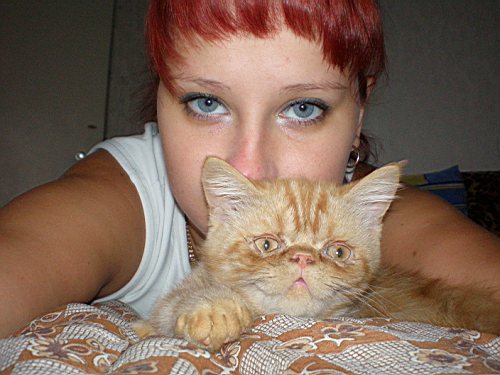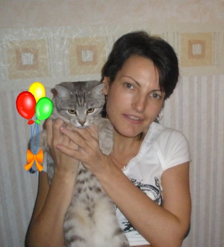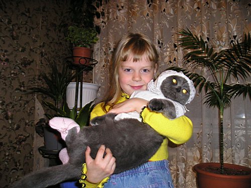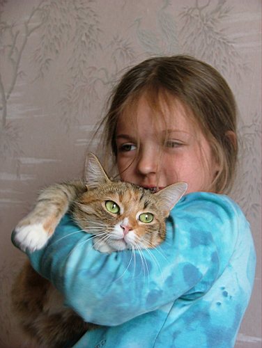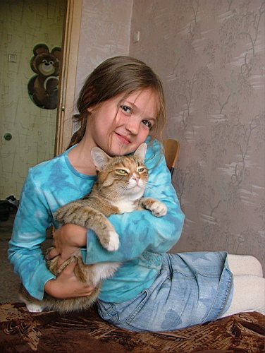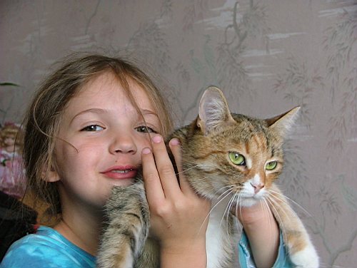 На фото - дочь Иванна с кошкой Симой, ей сейчас 4 года. Это обычная дворовая порода, на одной из фотографий Сима со своим котенком Эми