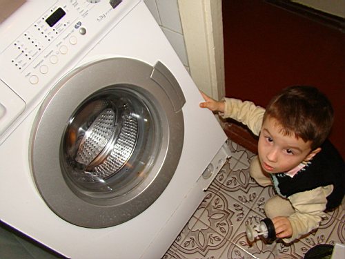 Фотография моего трехлетнего сына, во время чистки фильтра в стиральной машине
