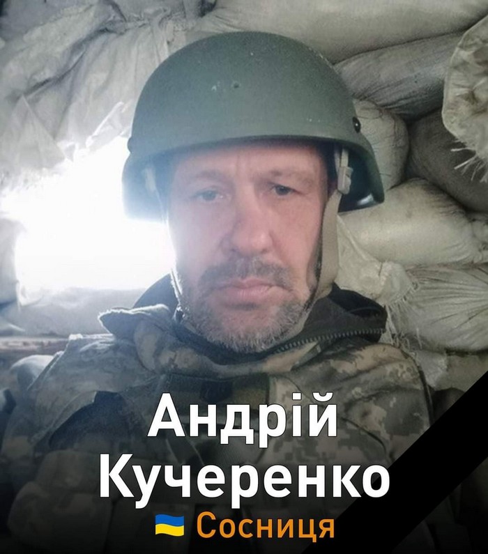 Солдат Кучеренко Андрій Борисович народився 9 грудня 1971 року у місті Фрунзе (нині - Бішкек, Киргизстан). З часом переїхав до Сосниці на Чернігівщину, де надалі і проживав. Навчався у місцевому ПТУ №31, там опанував професію "тракторист - машиніст широкого профілю". Протягом 1990-1991 років проходив строкову військову службу. Після початку повномасштабної війни, у квітні 2022 року, долучився до лав оборонців України. Службу ніс у складі одного з підрозділів військової частини А4674 на посаді стрільця-помічника гранатометника. Загинув 13 серпня 2023 року внаслідок ворожого артилерійського обстрілу на Запоріжжі. Попрощалися з Захисником та поховали його на кладовищі Сосниці.