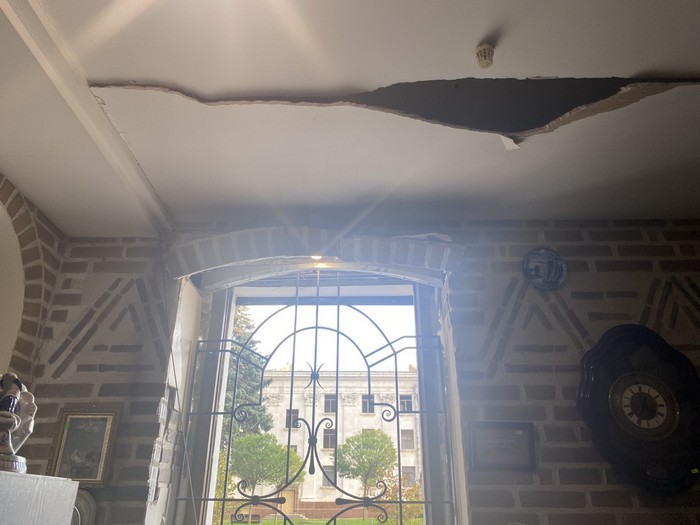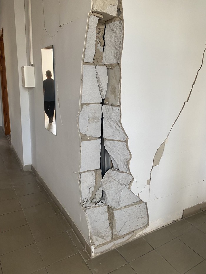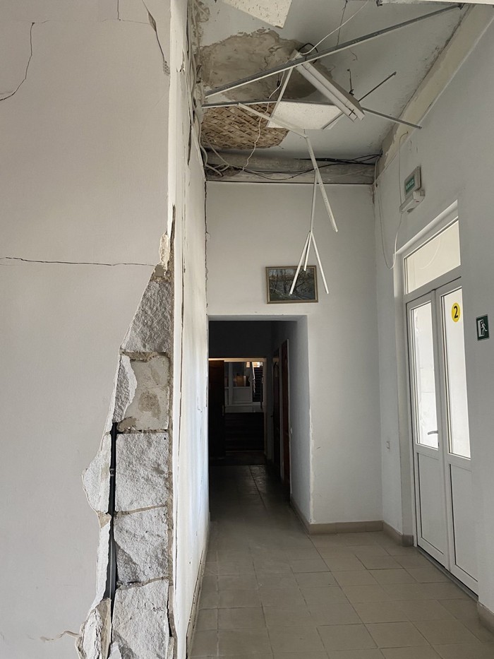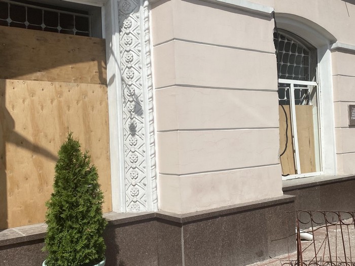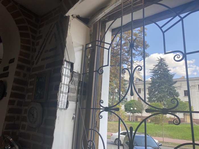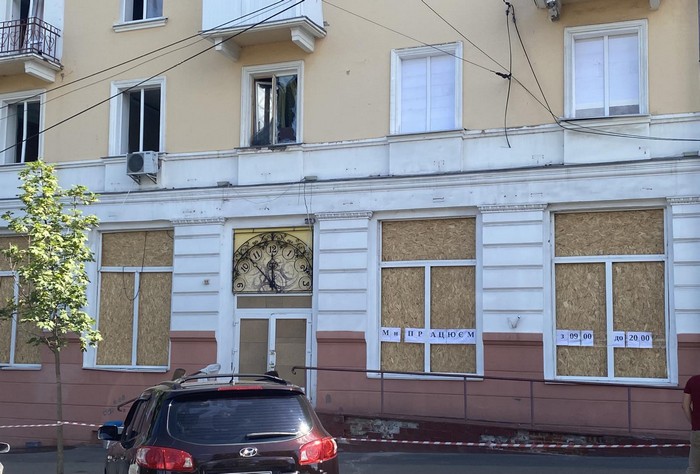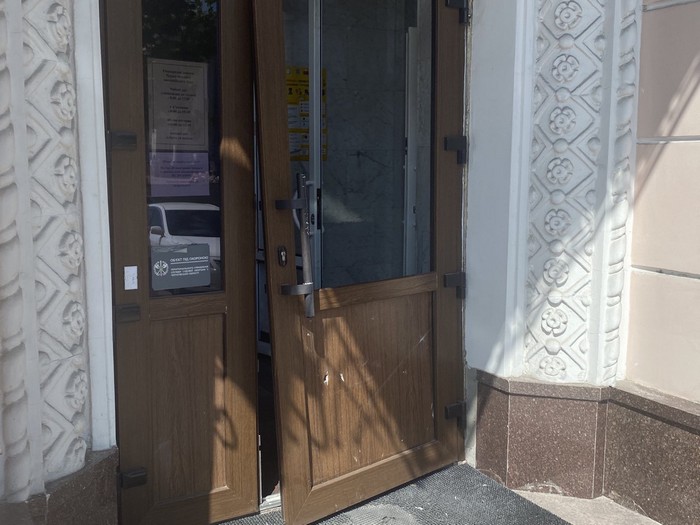 Після ракетного удару з вулиці помітно відсутність вікон у будівлі, на вході - перекошені від ударної хвилі двері, які проте відчиняються.