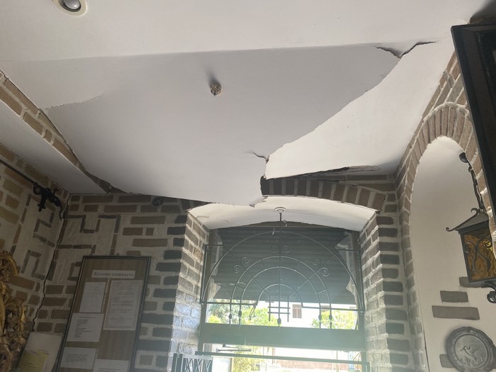 «Ви звернули увагу на металеву огорожу перед будівлею суду? Вона злетіла з даху і ніби навмисно стала перед будівлею», - говорить Володимир Гайдай. На його думку, до початку опалювального сезону вкрай важливо закрити тепловий контур будівлі - відновити вікна і дах.