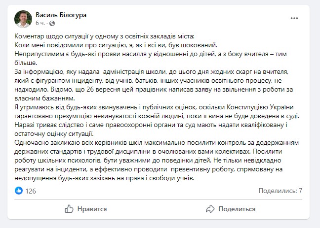 – Як зʼясувалось за ці два дні, що таких випадків дуже, дуже багато ми написали в чатах усюди батьки пишуть, що такі моменти були. Підходили старшокласники, казали що це постійно таке є навіть свідчили дівчата, які вже закінчили школу. Розповідали, що таке постійно бувало, що він міг підійти і за сідниці потримати, – каже батько учениці Сергій.
