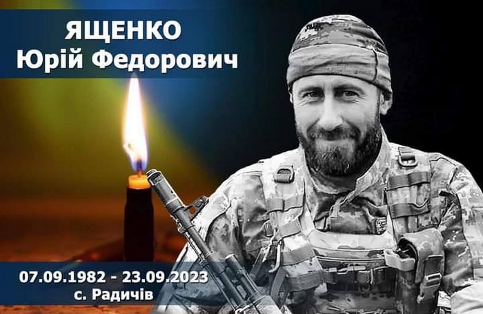 Солдат Ященко Юрій Федорович народився 7 вересня 1982 року. Після початку повномасштабної війни захищав Батьківщину в складі одного з підрозділів військової частини А4532 на посаді навідника механізованого відділення. Загинув 23 вересня 2023 року під час виконання бойового завдання на Донеччині. Попрощалися з воїном та поховали його в селі Радичів на Коропщині.
