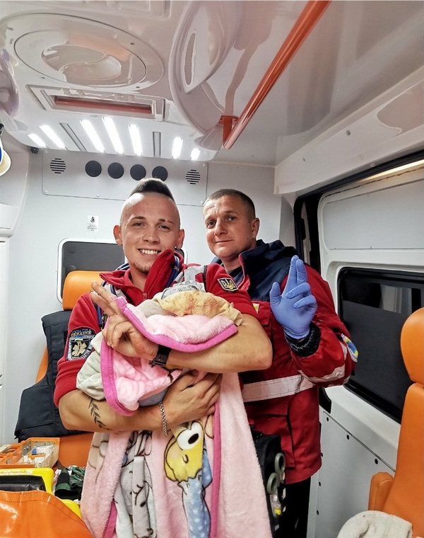 На фото - фельдшер Влад Ковпинець (з новонародженою на руках) і водій Андрій Коробко
