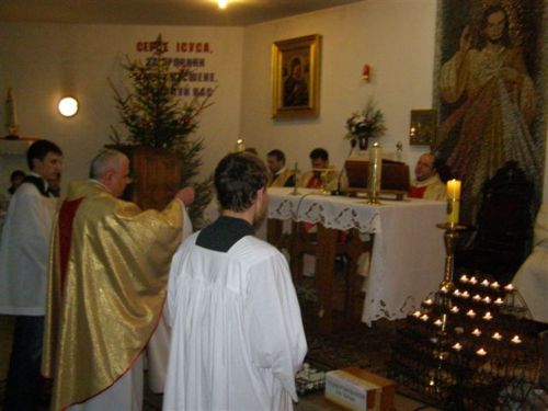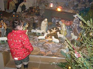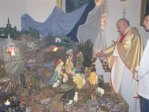 Я побувала на Різдвяній службі ввечері. Вона тривала в нижньому храмі, оскільки у верхньому ще не правиться. Праворуч від вівтарної частини був розташований чудовий мальовничий вертеп! Виявляється, цей вертеп з’явився у нас минулого року – це подарунок монастиря з Регентсбургу, того міста, в якому жив колись кардинал Рацингер – нинішній Папа Римський. Коли він приїздив до себе додому, то завжди служив у тому монастирі. Майстер, котрий створив цей вертеп, старанно й натхненно передав атмосферу свята Різдва Христового – радісну, благоговійну, чудесну. Це справжній шедевр, який варто побачити!
