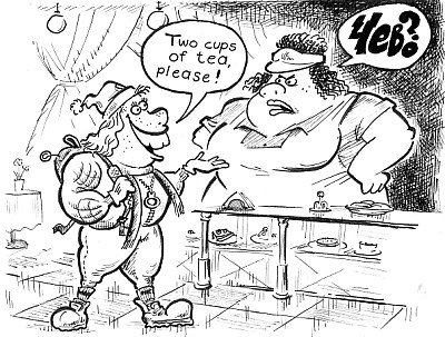Представьте же себе наше разочарование, когда на простенькую фразу «Two cups of tea, please!» молоденькая кассирша в лучших традициях украинского гостеприимства ответила: «Чево?» Повторили. Но когда девушка переспросила: «Черный или зеленый?», мы себя выдали! Марина сразу выбрала black, а я - green. Правда, официантка на это не обратила внимания. Взяли еще по чизбургеру, устроились за столиком и принялись изучать посетителей. Оказалось, что среди них было немало иностранцев настоящих, а не липовых - как мы. По нашим личным наблюдениям, англоязычных туристов частенько можно встретить также в ресторанчике «Два гуся». Это место облюбовали волонтеры «Корпуса мира», которые работают в Чернигове. По-видимому, их там понимают. Обратила внимание еще на такой момент, как перевод меню на английский. Пока немногие заведения в Чернигове могут похвастаться англоязычным списком блюд.
