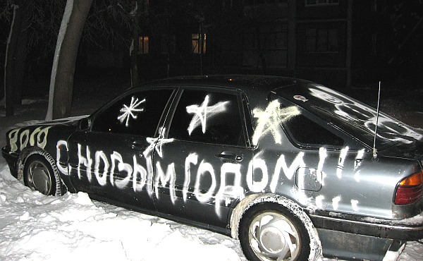 Вечером 1-го января шел из гостей и моему взору предстал вот такой вот симпатичный автомобильчик, украшенный новогодними надписями из искусственного снега. Видно хозяева, или их соседи решили повеселиться и вместо ёлки таким образом украсить машину. Интересно было бы ее увидеть на ходу в городе, в дневное время.