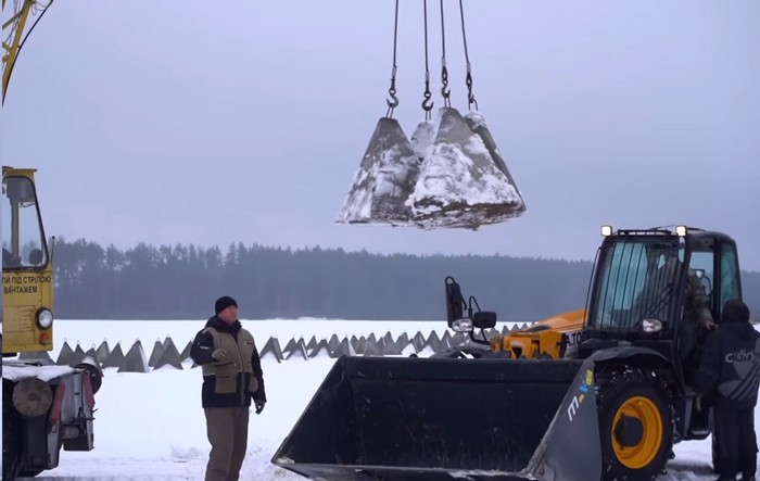 Генерал-лейтенант показав відео, на якому видно, як екскаватор риє траншею, а робітники за допомогою техніки встановлюють протитанкові бетонні конструкції, відомі як «зуби дракона».