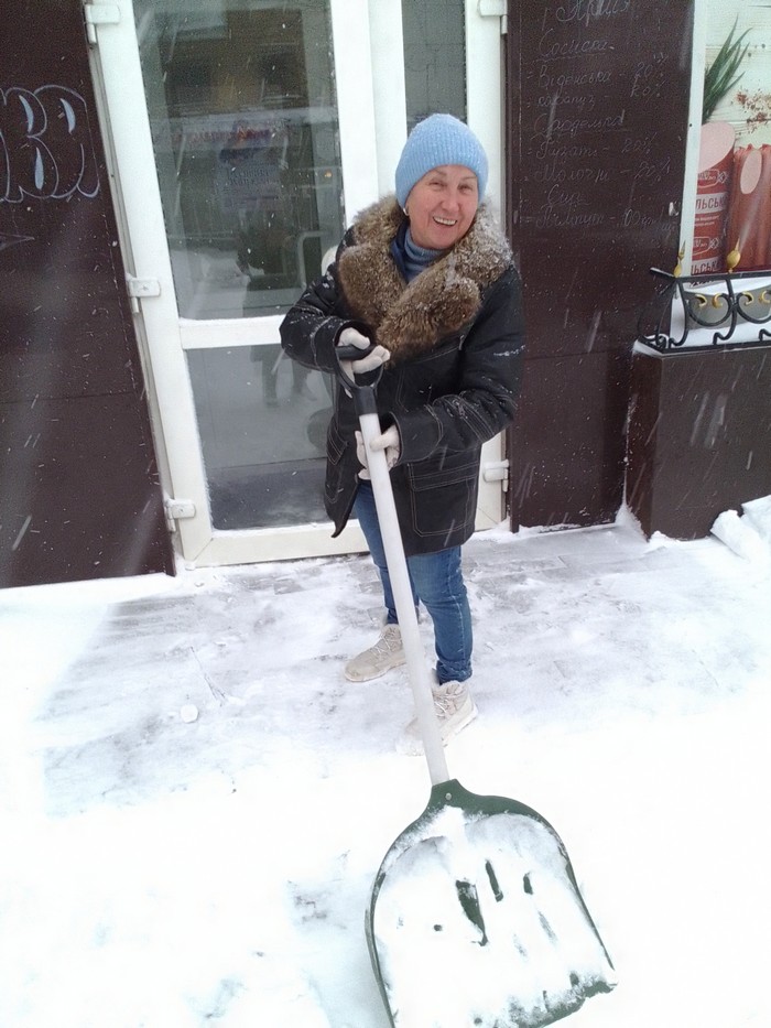 Алла Геннадіївна, мама господині магазину “Продукти”, що знаходиться біля РАГСу, підштовхувала сніг лопатою ближче до проїжджої частини дороги.