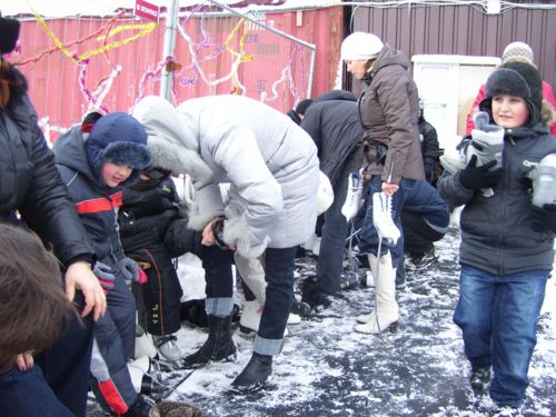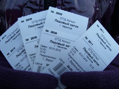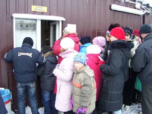Вторая очередь образовалась во дворике катка, возле пункта выдачи коньков (их прокат входит в стоимость билета). У кого были свои – быстренько экипировались и первыми выехали на лед. Коньки в прокате почти новые – «фигурки» и «канадки». И те, и другие – современного дизайна и в отличном состоянии. Размеры от 25 до 48. Точат их каждые два дня. Выдают в обмен на билет.