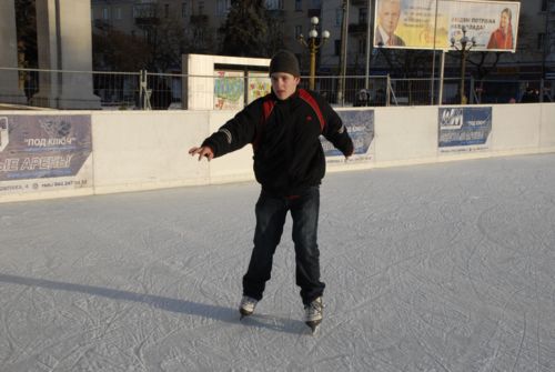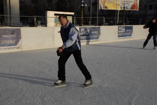 Среди первых гостей катка — в основном еле держащихся на коньках журналистов — внимание обращает на себя усатый мужчина, летающий по кругу то лицом, то спиной вперед, со спокойно заложенными за спину руками.