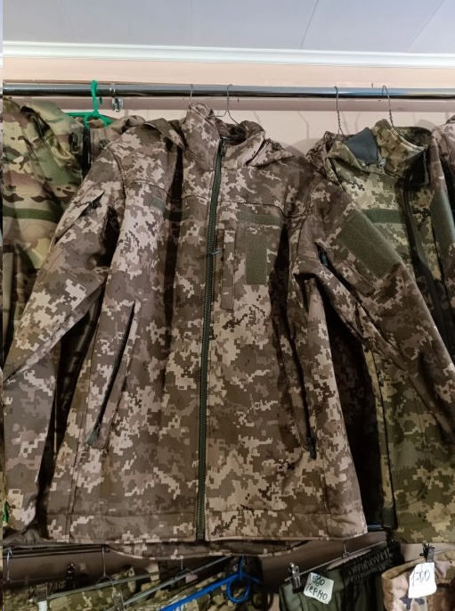 — Термобілизна, куртки софтшел (із захисним шаром від вітру й доїду) на мікрофлісі, — показує 52-річний Сергій Ткаченко, власник. Допомагав одягати та взувати армію з 2014 року. Нагороджений за це грамотами, виданими начальниками частин. Оригінали подяк висять у самому магазині. — У мене така куртка — дві тисячі гривень. Приталена, тож і жінки беруть добре. Штани до таких курток теж водозахисні. Прошив звужений у ногах. Для жінок підходить. Півтори тисячі гривень коштує.