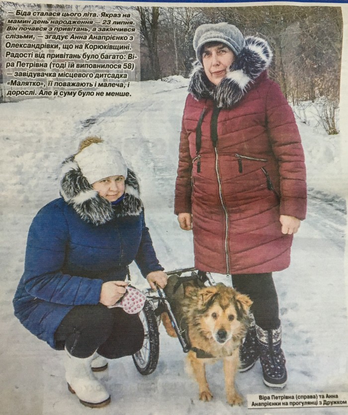— Візок обійшовся у п’ять з половиною тисяч гривень, ліки — у понад дві з половиною тисячі, — відповідає. І просить подякувати через газету всім, хто допоміг поставити Дружка на ноги. Зокрема відомій у місті зоозахисниці — голові профспілкової організації працівників освіти Корюківщини Аллі Кириченко, яка підтримала і фінансово, і порадами.