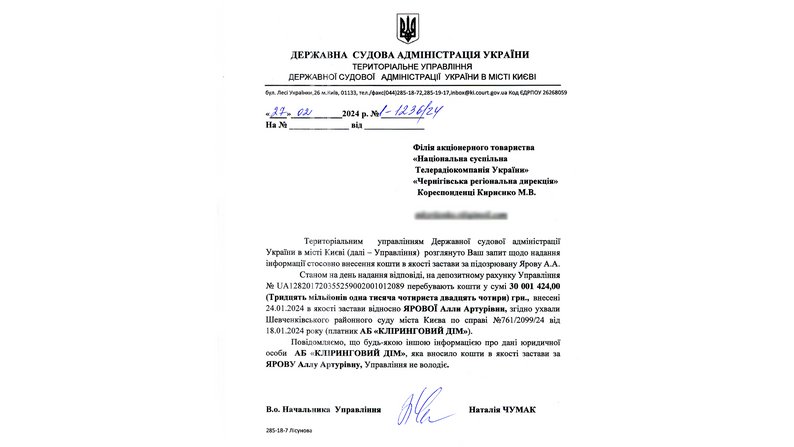 У відповіді територіального управління Державної судової адміністрації України в місті Києві йдеться, що заставу за Аллу Ярову внесло АТ "Банк "Кліринговий дім" 24 січня 2024 року.