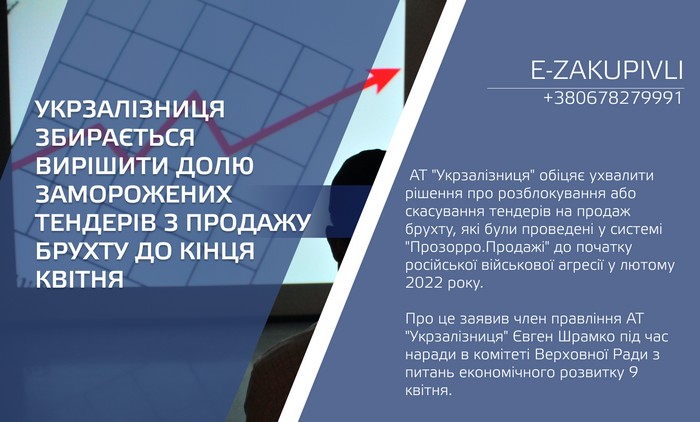 АТ "Укрзалізниця" обіцяє ухвалити рішення про розблокування або скасування тендерів на продаж брухту, які були проведені у системі "Прозорро.Продажі" до початку російської військової агресії у лютому 2022 року. Про це заявив член правління АТ "Укрзалізниця" Євген Шрамко під час наради в комітеті Верховної Ради з питань економічного розвитку 9 квітня.