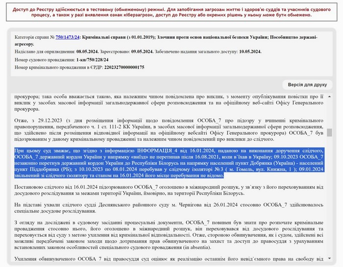 Деснянський районний суд міста Чернігова 8 травня ухвалив вирок стосовно жителя села Добрянка Чернігівської області, який у жовтні 2023 року потай перетнув білорусько-український кордон і потім знявся у пропагандистському репортажі на каналі «Білорусь 4 Гомель». Сюжет названо «Послання Зеленському».