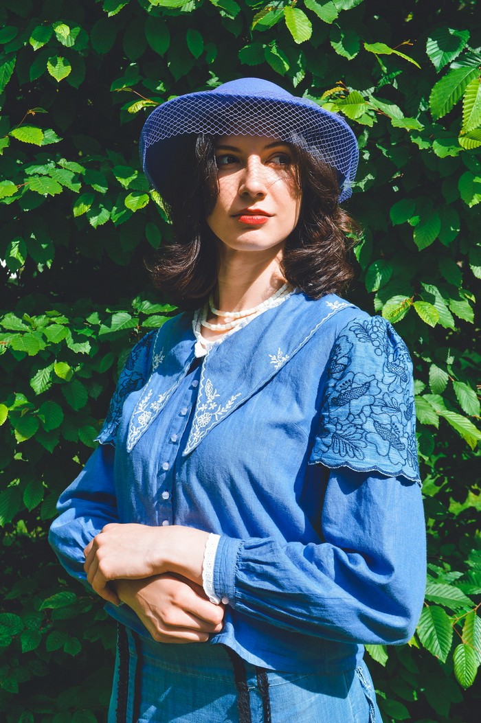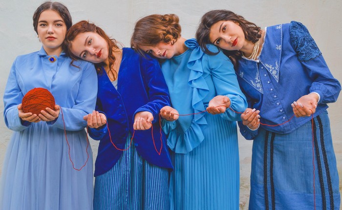 У виставi "Блакитно-бузковий будинок" глядачi познайомилися з чотирма перiодами життя Аспазiï, уродженоï Йоханни Емiлiï Лiзете Розенберг, роздiленими вiдповiдно до 4-х сезонiв року. Весна – юна Йоханна, яка робить першi кроки в поезiï (виконавиця ролi – Наталя Костюк). Лiто – молода Емiлiя, журналiстка та вiдома поетка (актриса ролi Евгенiя Ребенок). Осiнь – зрiла Лiзете, визнана мисткиня (артистка Вiкторiя Похилець). Зима – лiтня Аспазiя, берегиня лiтературного спадку своего чоловiка (виконала Крicтiна Чорна). Цi чотири портрети, написанi у рiзнi роки життя видатноï жiнки, допоможуть скласти ïï цiлiсний образ.