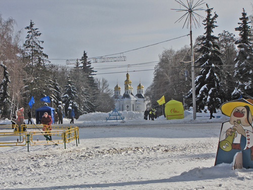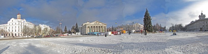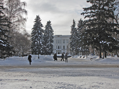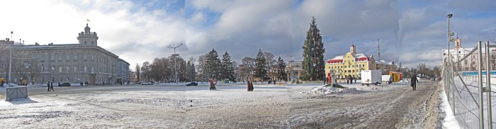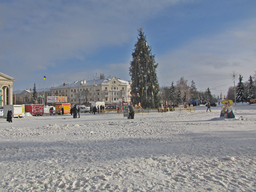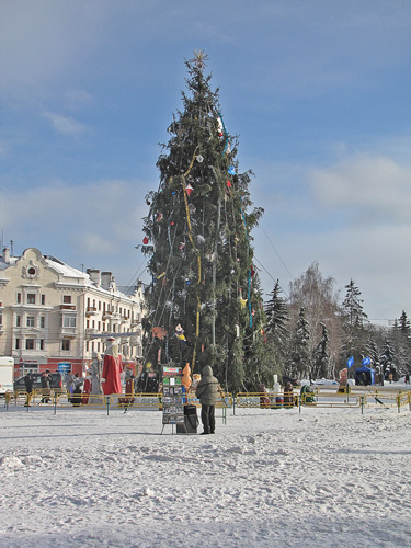 На этой площади проходят все главные торжества нашего города. Обильно накрыло снегом в этом году главную площадь. Величественно и торжественно ждет своих посетителей главная елка города. Приукрасились к празднику здания вокруг, и только искусственный каток немного портит праздничный ландшафт, напоминая чем-то «загон», но настроение это горожанам не испортит. Каток – дело хорошее!