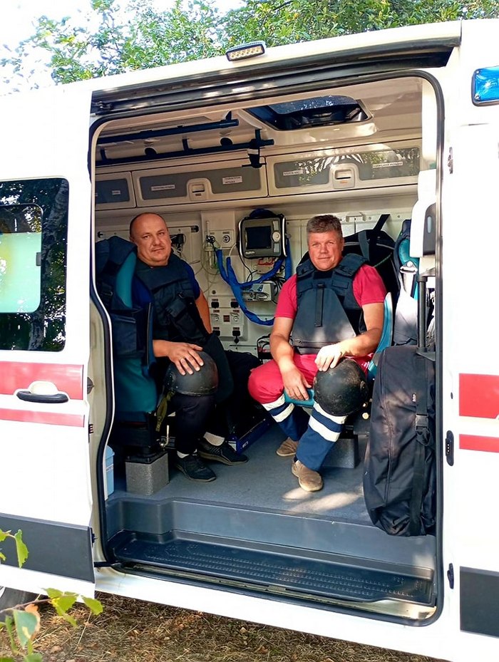 Олександрові Помозку 39 років, на «швидкій» працює із 2007-го. Від початку повно- масштабного вторгнення вони з водієм Дмитром Чубикі- ним постійно виїжджають на виклики в прикордонні села і по самій Семенівці, у тому числі й на місця обстрілів. Чи не страшно — не питаю... Лише про те, як убезпечуються.