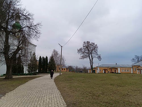 Чернігівський Єлецький Успенський монастир. З Петропавлівської церкви (жовто-оранжевого кольору) виходять монахині. Одна. Хвилин через 15 — друга. У чорному довгому вбранні. Чорних головних уборах. Немолоді. Згорблені. Прямують через двір на трапезу. На сніданок.