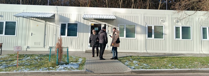 Поліклініка зовні як звичайна модулька. Модульний будиночок для житла. Тільки в середині облаштована по медичному. Заходиш — зліва ресепшен (мініреєстратура): стіл за невисоким склом. Поряд — кулер з питною водою. Є й скляна ваза з карамельками. Як у приватних центрах чи клініках. Є туалет. Лавки для відвідачів.