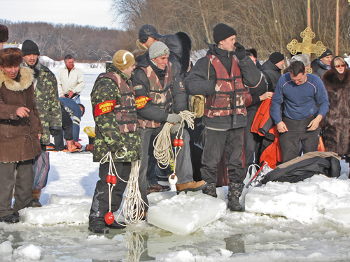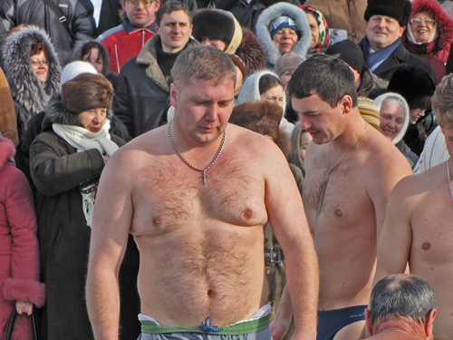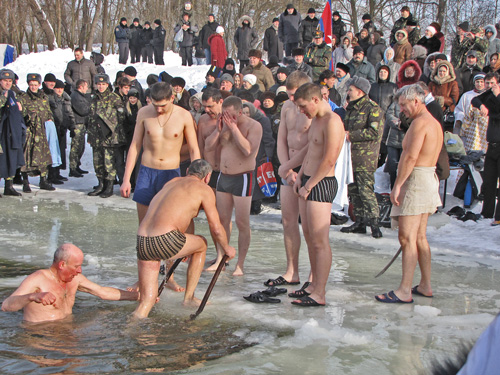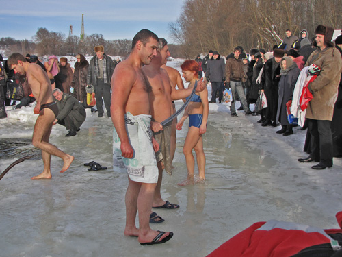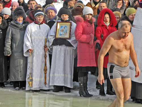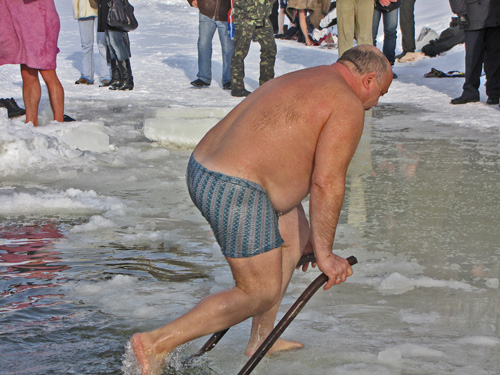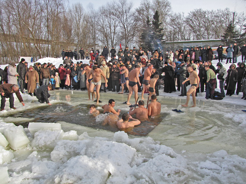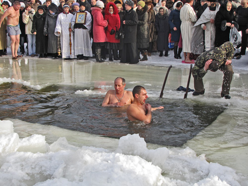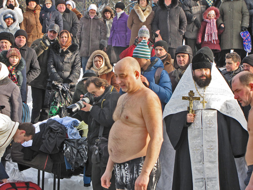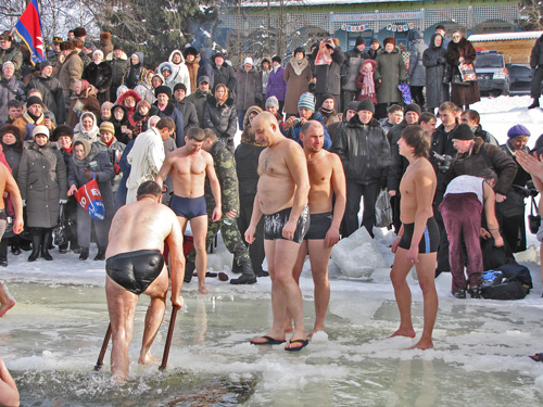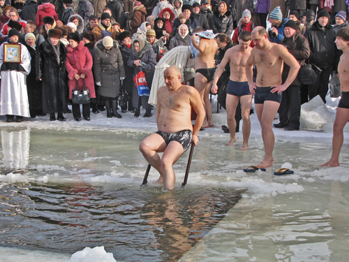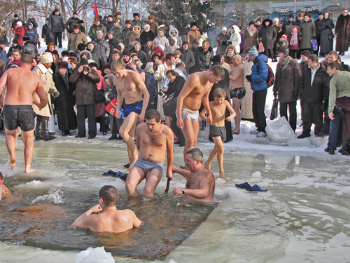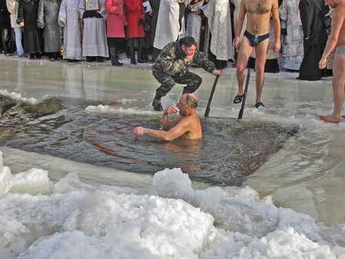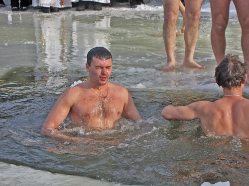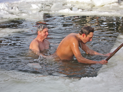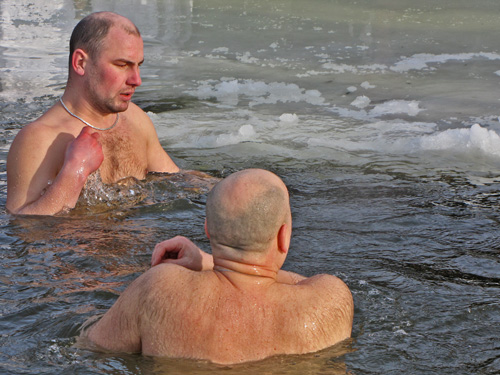 После освящения воды каждый желающий мог искупаться в проруби. Люди прыгали в ледяную воду и плескались в холодной воде. Для кого-то – это подвиг, кому-то – каждодневное купание. Среди пловцов были замечены и городские депутаты.